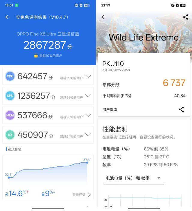 Judging from the running score results, OPPO Find X8 Ultra AnTuTu running score can reach 2.86 million, among which the GPU has made significant progress, with a running score of 1.23 million, which means that OPPO Find X8 Ultra can easily handle various large-scale mobile games. In the 3D Mark Wild Life Extreme test, OPPO Find X8 Ultra’s overall score is 6737, which is also a significant improvement compared to the previous generation of products.
