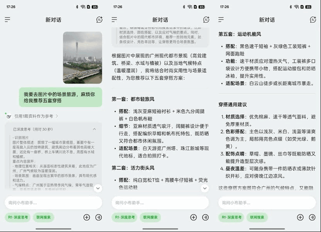 First of all, Xiaobu is now connected to the Deepseek model. If there is nothing special about connecting to Deepseek, then what if it can understand you? That’s right, OPPO has equipped Deepseek with a multimodal recognition function, which can directly recognize both documents and pictures. For example, after giving Xiaobu a photo taken in Guangzhou, and asking him to provide five sets of travel outfits suitable for this place, DeepSeek will recognize the information in the picture, and combine it with online search for in-depth thinking and give the corresponding answer. Not only that, thanks to the dedicated server built by OPPO, it will be more stable to use.