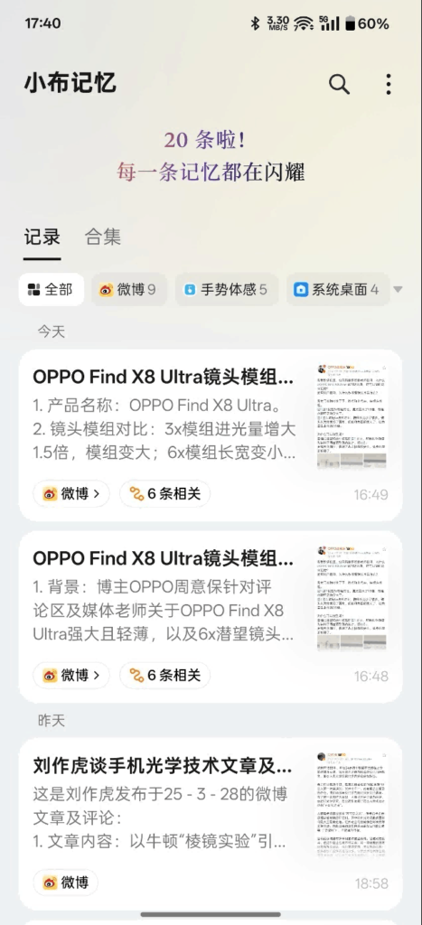 After the three-stage mute lever of the Find series was turned into a shortcut key, OPPO also gave it a new function. With a light tap, you can turn on the new “AI Flash Memory” function, which can intelligently identify, analyze, and record various information on the current screen according to the content on the screen, and store it in “Xiaobu Memory”. Xiaobu Memory will centrally manage this information for you, and intelligently classify and organize it, automatically filing the information in the best location.